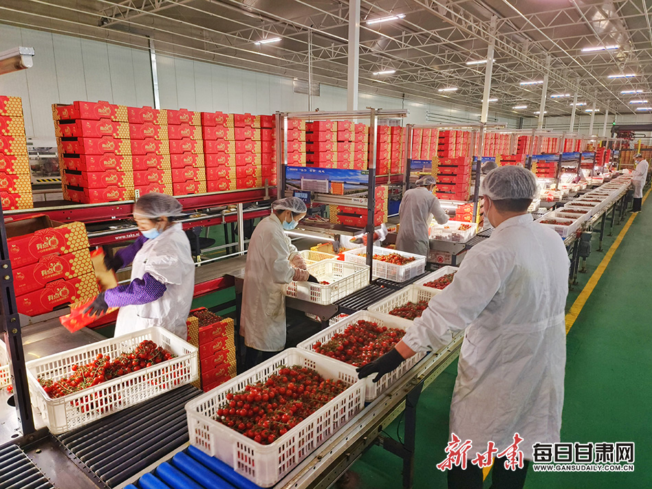 张掖超越培养的产业工人正在忙着分拣串番茄。
