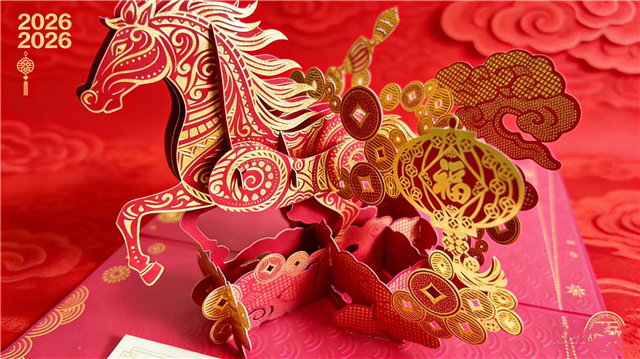 贺卡内页采用3D立体工艺,一匹天马跃然纸上,元宝叠翠,云纹流转,灯笼摇曳簇拥着腾空而起的天马,将“一马当先”“福运绵长”的美好祈愿尽数藏在其中。可赠予亲友,让每一份祝福都带着丝路天马的祥瑞与温情。