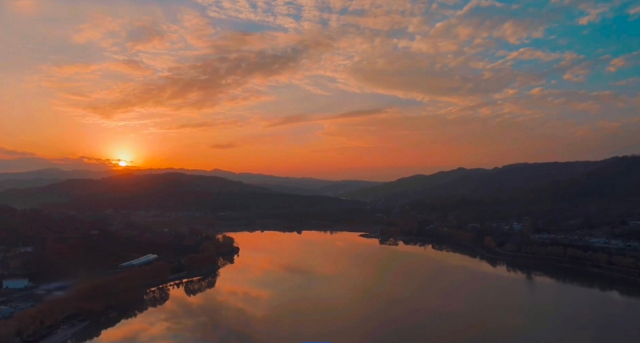 黄昏时分,湖水如镜,将漫天云霞、连绵山峦与岸畔金树悉数收纳。夕阳似温柔画师,把天空染成橙红渐变画卷;湖畔白色雕塑静立,红色装饰点缀其间,与自然共同谱写诗意。航拍视角下,蜿蜒湖岸线勾勒出大地曲线,绿波、金叶、褐田交织成几何色块——这是陇南赠予深秋的宁静仪式。