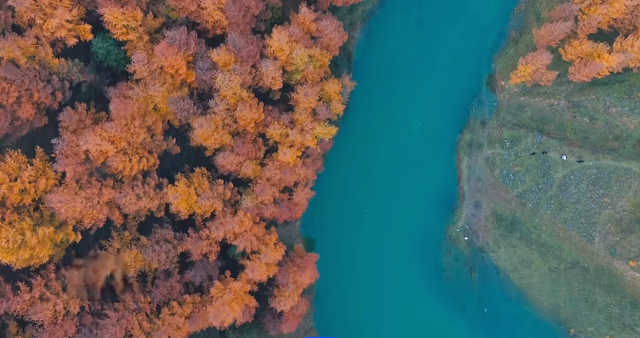 蜿蜒公路如白色丝带,穿梭于斑斓林海之间。车辆与行人成为画中灵动笔触,而森林才是真正的主角:橙、金、红、绿、褐……所有颜色在此碰撞又和谐共处,如同大地打翻的调色盘。水库碧水如宝石镶嵌其中,与暖色林带形成冷暧对比。俯瞰之下,每一帧都是自然的抽象画,每一道曲线都是地貌的抒情诗。