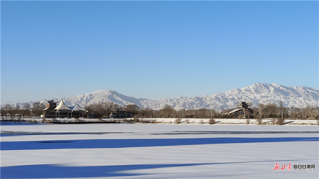 流沙河景区内,亭台栈道被白雪轻覆,宛如冰雪雕琢的琼楼玉宇。远处祁连山雪峦如黛,与丹霞山大殿遥遥相对,朱红殿宇镶嵌在茫茫雪原中,山之雄浑、殿之古朴与雪之纯净完美交融,一步一景皆含诗意。双泉湖则藏着冬日里的灵动生机,湖面覆着一层薄冰,成群天鹅悠然游弋于澄澈水域,洁白羽翼在雪色映衬下愈发洁净,偶有低鸣划破静谧,为冬日增添了几分鲜活气息。