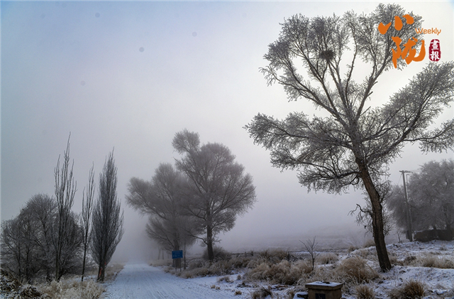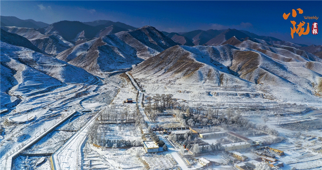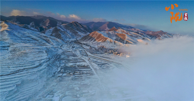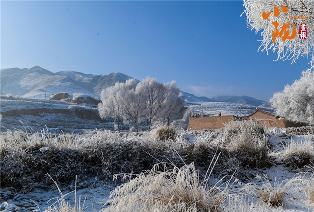 山下的屋舍静卧于无边的洁白中,浅蓝天色渐次晕染,苍灰山脊如墨笔勾勒,山川草木皆成了画中疏淡的笔意,低诉着悠长的冬韵。