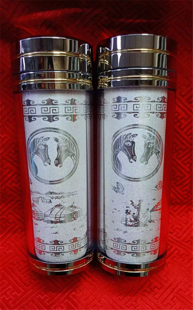 以黑山岩画中的马图腾为核心设计元素,将千年游牧文明凝于杯身。杯身的双马头图案昂首相对,线条复刻岩画的古朴质感,搭配草原毡房、牧歌场景的錾刻纹饰,辅以传统回纹边框,既还原了肃北牧民逐水草而居的生活图景,又让草原骏马的灵动气势跃然眼前。纯银内胆兼具温润质感与实用功效,金属杯身的金银镶边设计更添精致厚重。