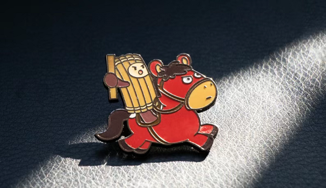 悬泉置遗址景区快马加鞭金属徽章以汉代悬泉置传马文化为核心IP,其设计灵感来源于悬泉汉简《建始二年三月悬泉置传马名籍》中记载的传马“铁柱”——一匹红鬃白背(骝,乘,左剽,决两鼻,白背,齿九岁)的官马。设计亦汲取了文物“驿使图”中驿使策马疾驰的形象,徽章中的铁柱身背汉简、驰骋传信,生动讲述了古代悬泉置利用传马高效传递文书与信息的日常,让跨越千年的驿传画面跃然于方寸之间。