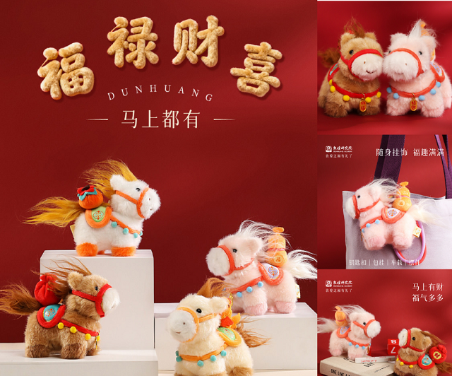 袋袋纳财款,萌马驮着鼓鼓财袋,寓意八方财源尽入袋中,日日有进账;萌态驮禄款,圆润葫芦静卧马背,“葫芦”谐音“福禄”,藏着福禄双收、吉庆有余的祈愿;萌马携鲤款,灵动锦鲤相伴马身,借鲤跃龙门之意,助你梦想成真,财气好运双双临门;萌马驮柿款,饱满柿子逼真鲜活,“柿子”谐音“事事”,愿你万事顺遂、心想事成。每一款都萃取敦煌翼马的千年吉祥底蕴,让软萌身形载着敦煌的诗意祝福,为你解锁全年福气与财气。