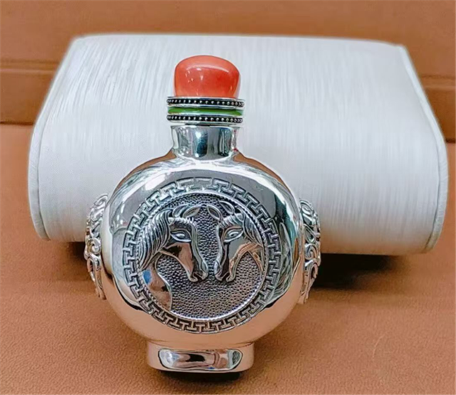 肃北非遗文创——双马呈祥纯银鼻烟壶