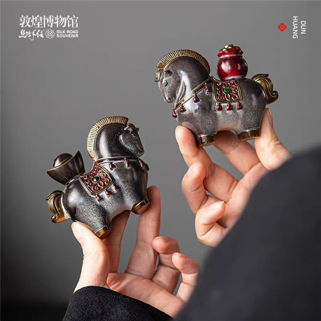 该摆件设计灵感源自西夏青铜马形饰牌,将传统祥瑞寓意与当代茶席美学巧妙结合。它以树脂为材质,表面采用精致印花工艺,勾勒出鎏金鞍辔、宝石纹样等细节。一对茶宠分别驮着金元宝与福袋,对应“马上有钱”“马上有福”的双重吉兆,既是茶桌上的点睛之笔,也是承载美好期许的马年伴手礼。小巧的尺寸(高约7cm,长约9cm),无论置于茶盘、案头,还是作为新年赠礼,都能传递一份来自敦煌的祥瑞祝福,让传统福气融入日常茶事与生活美学。