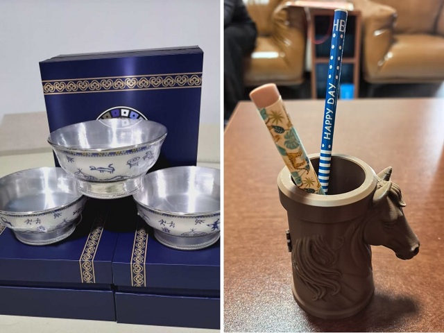 笔筒采用立体浮雕工艺,筒身的马头纹理复刻了肃北黑山岩画的古朴质感,搭配“肃北”字样的篆刻设计,既点明了文化根源,也让草原骏马的雄浑气势凝于方寸之间。