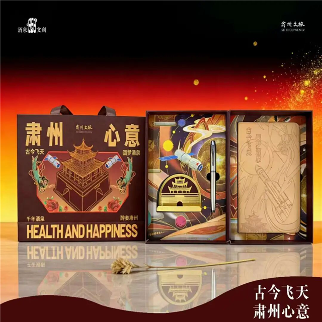 肃州心意礼盒以酒红底色衬肃州厚重,内含印有酒泉航天、飞天、祁连元素的文具,外观融丝路回纹与极简线条,精致又实用,让文脉荣耀伴日常书写。