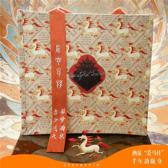 酒泉“爱马仕”托特包以象牙白主色配“万寿无疆”底纹,包挂镌汉代“长宜子孙”隶书,侧面缀魏晋飞马图腾,融安康福祉、汉风雅致与马到成功之意,细节藏古韵,灵动又昂扬。