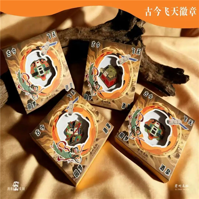 古今飞天徽章以酒泉鼓楼为核心浮雕,外圈卫星轨道绕星轨,融合敦煌飞天形象,将飞天彩带与卫星部件巧妙结合,鼓楼承古韵,轨道映航天,诠释艺术传承与数字时代的全新绽放。