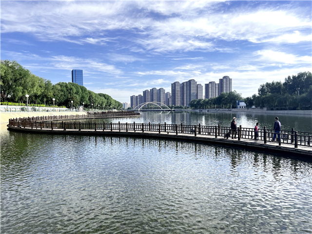 继续北行,海藏湿地公园静卧城西北。这里既有北方的粗犷豪放,又有江南水乡的柔美婉丽。园内人工湖碧波荡漾,芦苇丛中不时传来水鸟的鸣叫。登观景台向北眺望,海藏古刹在绿树丛中隐约可见。