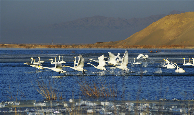 20世纪50年代,青土湖曾一度完全干涸,形成长达13公里的风沙线。石羊河流域重点治理以来,综合运用压沙造林、下泄生态用水等治理措施,青土湖形成人工季节性水面。如今的青土湖,在夕阳的余晖里,层层碧波展新颜,群群水鸟舞蹁跹。
