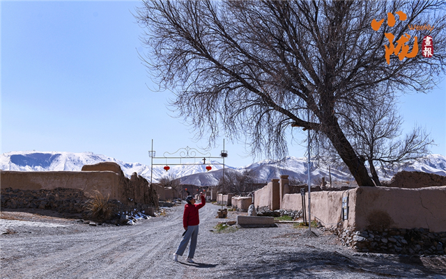 古村巷陌,藏着岁月沉淀的温柔。土坯墙围起旧时光,枝桠疏朗的老树斜立路旁,远处雪峰在晴空下泛着清辉。红衣旅人抬手轻触枝桠,为这片沉静的乡土,添上一抹鲜活的暖意。(文/西北角·中国甘肃网记者 屈杰文 徐琳 图/寇明灿)