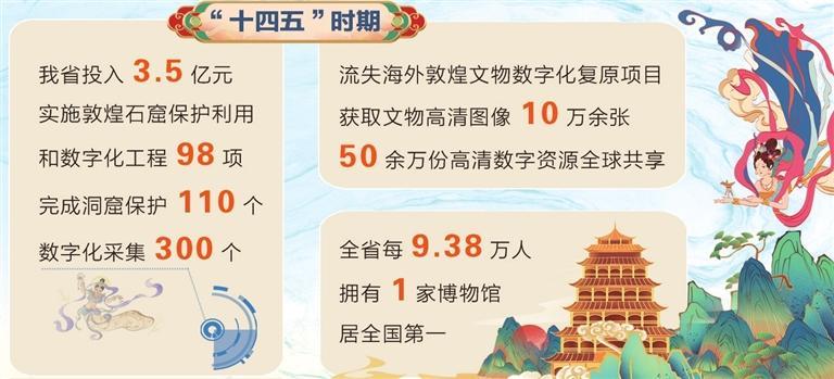 在文物保护提质升级方面,我省投入3.5亿元,实施敦煌石窟保护利用和数字化工程98项,完成洞窟保护110个、数字化采集300个,建成全球首个文物保护多场耦合实验室,制定国家和行业标准27项,科研成果服务16省市及部分共建“一带一路”国家;流失海外敦煌文物数字化复原项目获取文物高清图像10万余张,50余万份高清数字资源全球共享;第四次全国文物普查新发现线索4659条,投入24.26亿元实施900余项重要文保项目;打造河西走廊国家遗产线路,创建嘉峪关长城国家文物保护利用示范区,全省文物系统性保护成效显著,“中国特色・敦煌经验”国际影响力持续提升。