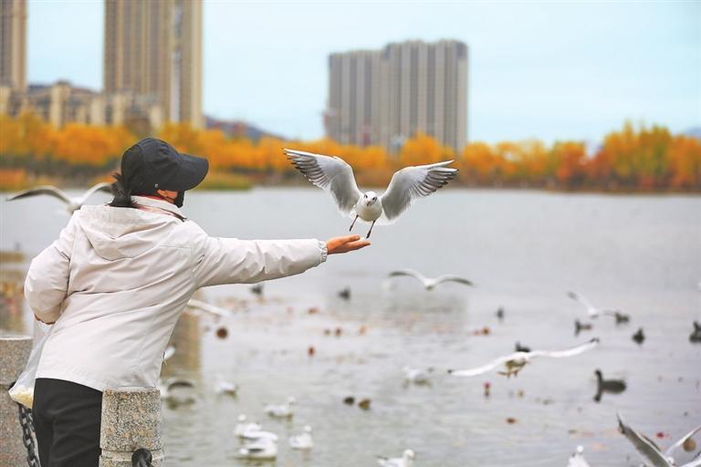初冬时节,定西市民与候鸟互动。(通讯员王克贤)