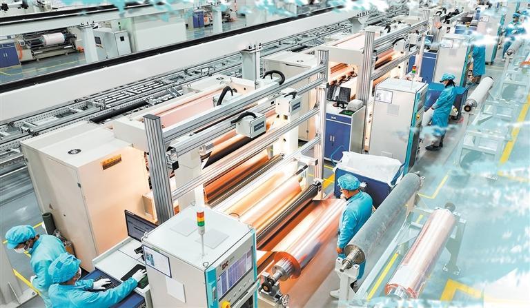 工人在甘肃海亮新能源材料有限公司生产线加紧生产。(记者丁凯)