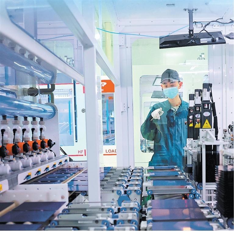 酒泉正泰新能源科技有限公司光伏组件生产线正在加紧生产。(记者田蹊)