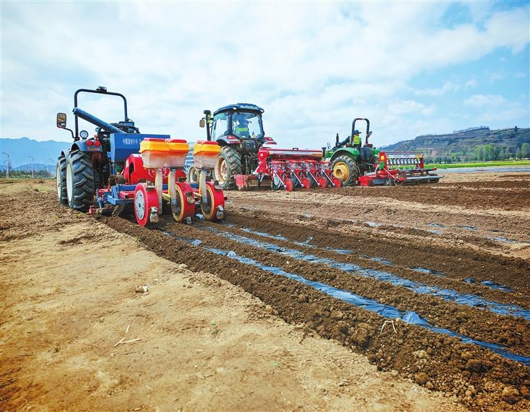高标准农田里无人驾驶农机实现覆膜、起垄、点种一体化。(本文图片均由记者马国顺摄)