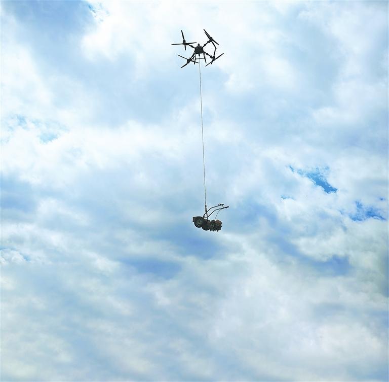 在近期的农机具集中演示推广活动中,102台套丘陵山区农机装备集中亮相,涵盖粮油生产各个环节。在现场,一部50公斤的手扶式旋耕机在大型无人机的吊载下直冲云端,短短几分钟,就把农机具送进了不具备通行条件的田块。负责飞行保障的马彩学介绍说:“这种方式可以直接将农机从公路吊运至田间,深受农户喜爱,但85公斤的飞行荷载在农忙时还是略显不足,我们已经升级改造了新机型,最大飞行荷载提升到95公斤,不仅是农机具、化肥、种子乃至收获的粮食,都能通过这种方式便捷地吊运。”