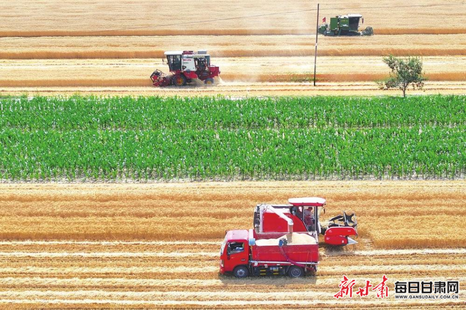 宁县新庄镇下肖村小麦良种繁育基地,收割机在麦田里穿梭。