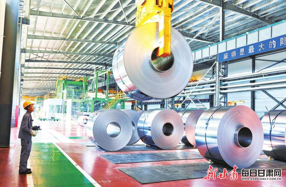 甘肃甬金金属科技公司工人正在生产线上调运轧成的不锈钢板带产品。
