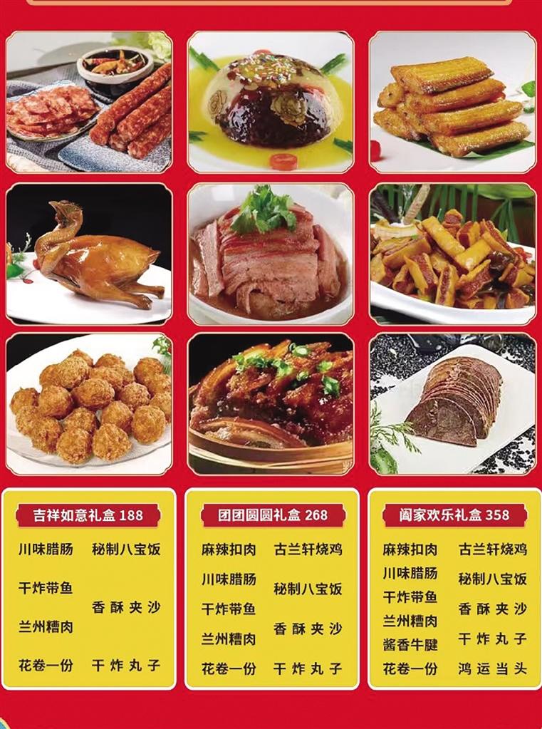除了老字号,德祥楼、和家和百合宴等本土知名餐饮机构也纷纷加码布局。和家和西固门店经理徐先生告诉记者,今年门店年夜饭已订满,目前仅提供外带及年货礼盒服务。门店特别推出两款百元左右的面食礼盒,以及198元至598元的多档位年菜礼盒,涵盖兰州糟肉、酱香牛腱子、黄河鲤鱼等经典陇味,满足不同消费需求。“往年年货礼盒以熟食为主,今年增加了主食、杂粮等品类,就是为了适配更多家庭的消费习惯。”