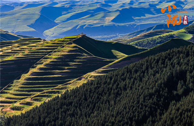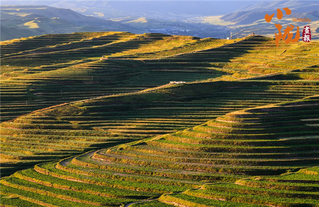 俯瞰那层层叠叠、高低错落的梯田,一种粗犷之美扑面而来。曲线蜿蜒如大地的指纹,把秋日的肌理揉得细腻。零星村庄嵌在田垄间,白墙黛瓦隐在黄绿交错里,每一眼都是藏在陇中深处的静谧。