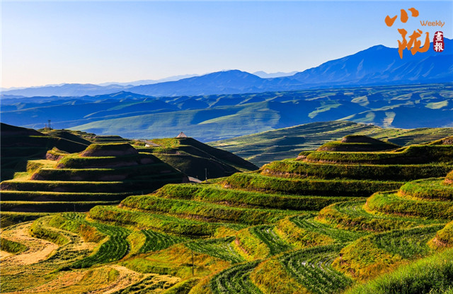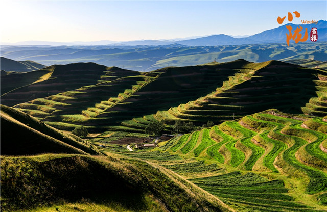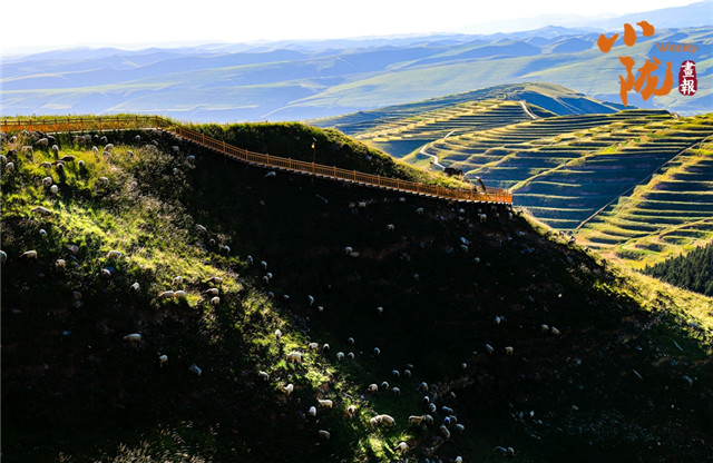 沟壑纵横,满目生绿。广袤的田野在阳光下尽情绽放着大自然的绚丽多彩,热烈地期盼着新季节的到来;羊群如散落的云朵,在坡地间缓缓移动,尽享这份宁静与和谐。