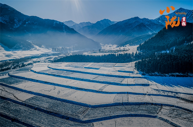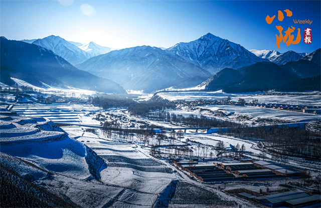 融雪斑驳似玉,在阳光的映照下熠熠生辉。轻柔铺展的白雪将起伏的山峦、静默的松林和山乡小居悉数包裹,尽展初冬的浪漫与诗情画意。
