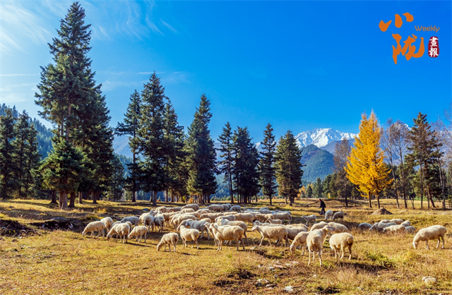 大地披上了金色的盛装,悠然自得的羊群、五彩的树木,与远处的雪山和湛蓝的天空、洁白的云朵,共同绘制成一幅初冬最亮丽的风景画。