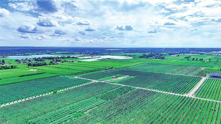 航拍泾川县丰台镇丰台墩村矮砧密植优质苹果示范园。