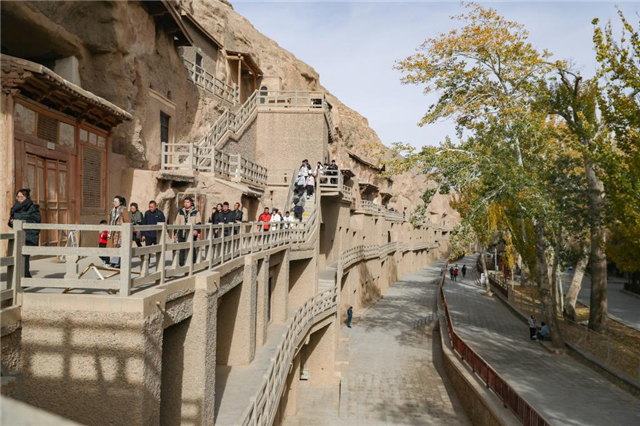 2024年11月14日,初冬时节,游客在莫高窟参观游览。新华社记者 郎兵兵 摄