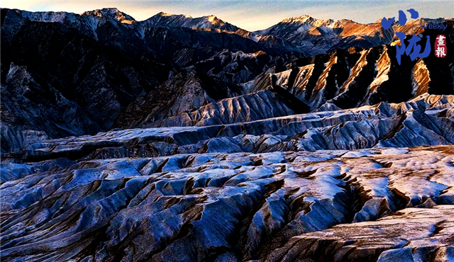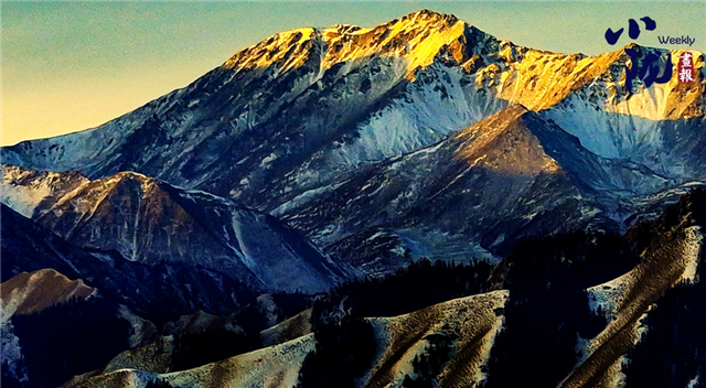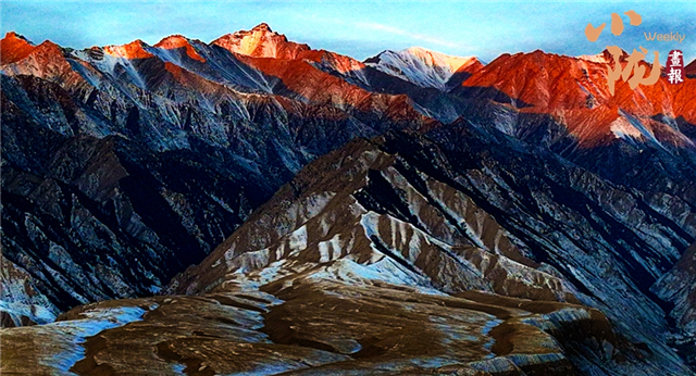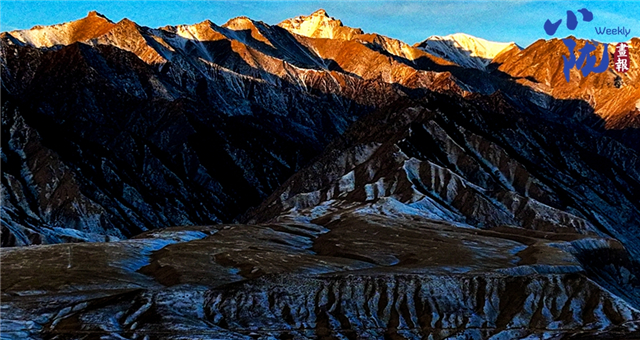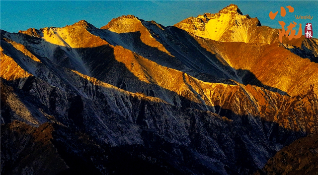 连绵雪峰沐于金晖之中,起伏的山脊与深邃的沟壑同辽远天宇温柔交融,光影与色彩交织,宛如天地合笔绘就的斑斓画卷。