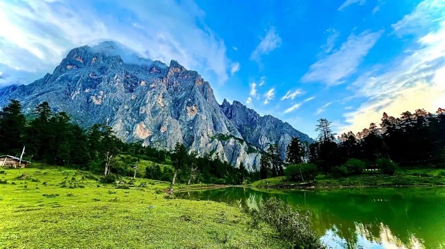 骨麻山巍峨耸立在湖畔,峰峦线条硬朗苍劲,山顶还留着未融的残雪,像戴了一顶莹白的绒冠。山脚下,原始森林褪去枯寂,苍劲的古柏抽出新绿,云杉挺拔直指云天,桦树的嫩枝泛着浅黄,层层林木顺着山势铺展,深浅交织,如墨色晕染的天然画屏。林间的高山草甸渐渐苏醒,融雪浸润过的泥土带着清新潮气,嫩草破土而出,织就一片柔软的绿毯,零星的野花藏在草间,紫的、白的、黄的,星星点点,为春日平添灵动的色彩。