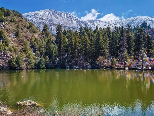 从夏河出发,一路向东,便抵达临潭县的冶力关风景区。天池冶海,作为景区内最神奇的山水名胜,在春日里,展现出独特的魅力。
